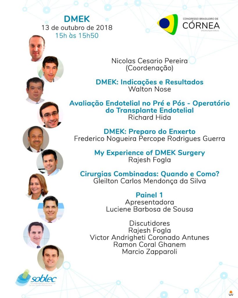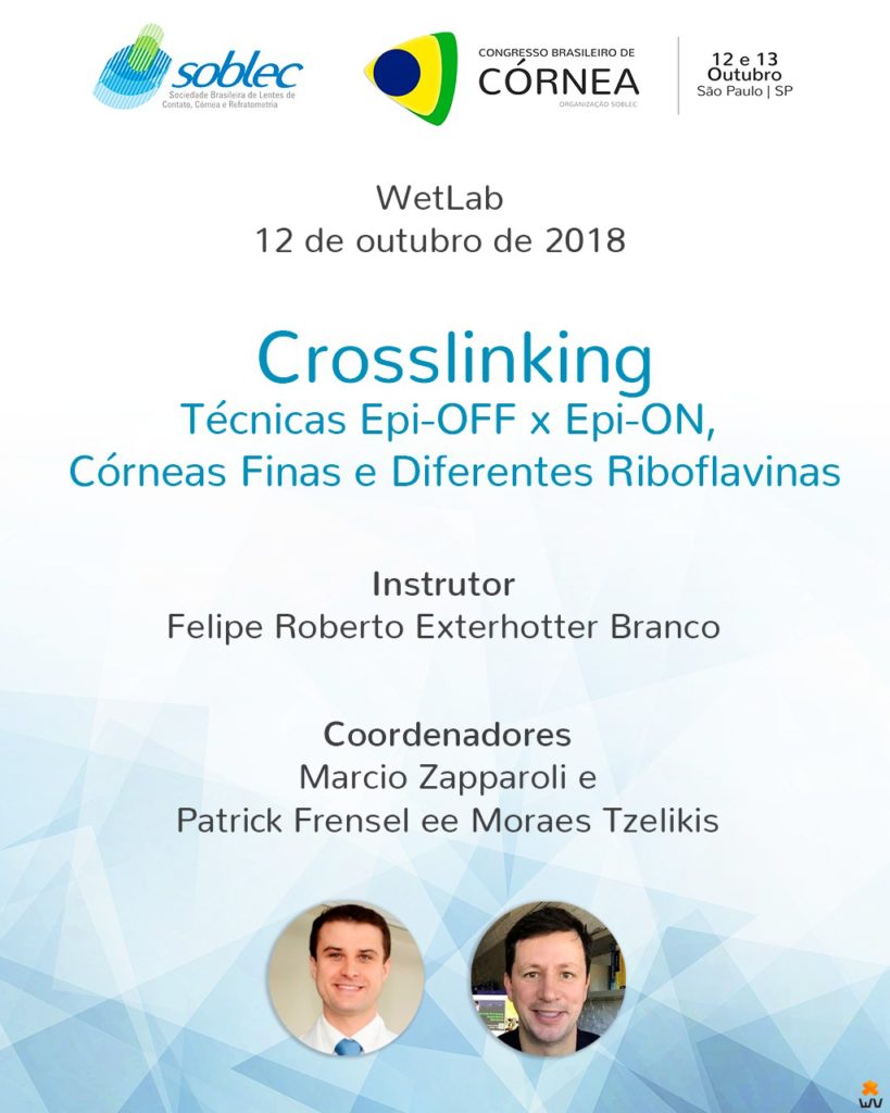 Nos dias 12 e 13 de Outubro, em São Paulo, o Dr. Márcio Zapparoli participou do Congresso Brasileiro de Córnea! O Dr. esteve presente no WetLab sobre Crosslinking como coordenador, debatendo sobre Técnicas Epi-OFF x Epi-ON, Córneas Finas e Diferentes Riboflavinas. Além disso, interagiu também como discutidor em um painel sobre Transplantes Endoteliais da técnica DMEK.